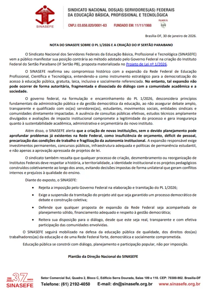 O Sindicato Nacional dos Servidores Federais da Educação Básica, Profissional e Tecnológica (SINASEFE) divulgou nota pública na última sexta-feria (30), manifestando posição contrária ao método adotado pelo Governo Federal para a criação do Instituto Federal do Sertão Paraibano (IF Sertão PB), com sede em Patos, prevista no Projeto de Lei nº 1/2026.