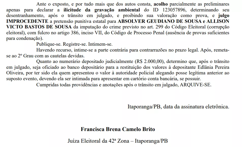 A Justiça Eleitoral da Paraíba julgou improcedente a ação penal movida pelo Ministério Público Eleitoral (MPE) contra o vereador Geudiano de Sousa (Geudo) e o prefeito Allison Victo Bastos de Sousa (Bastinho), acusados de corrupção eleitoral nas eleições municipais de 2024, no município de Pedra Branca, no Sertão paraibano. A sentença foi proferida pela juíza Francisca Brena Camelo Brito, da 42ª Zona Eleitoral de Itaporanga, nesta sexta-feira, dia 6 de fevereiro de 2026.