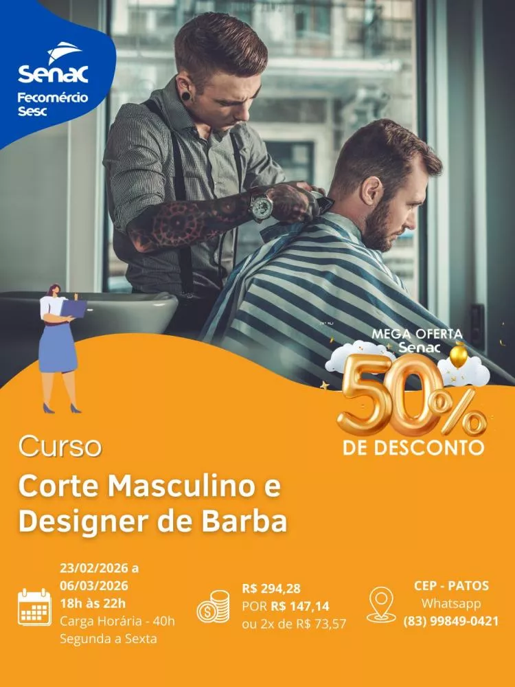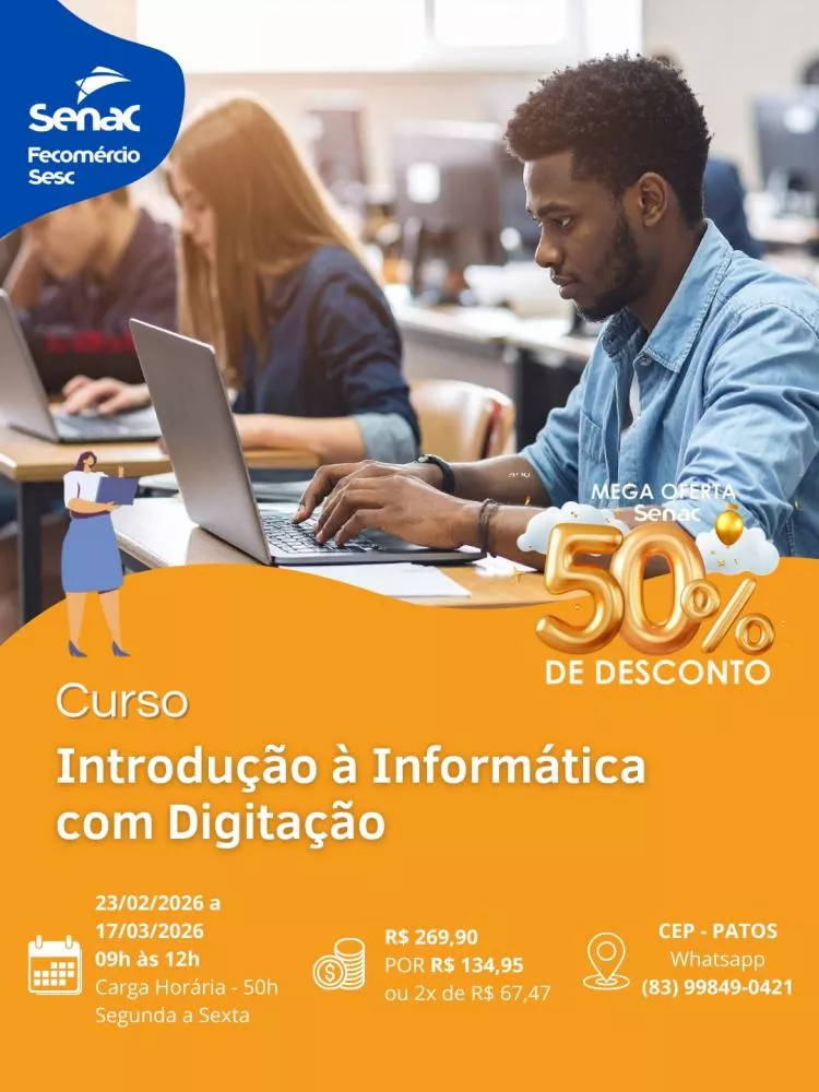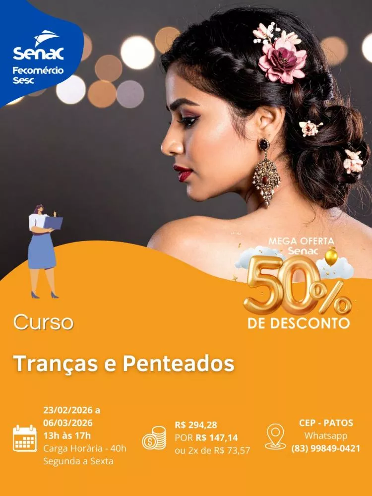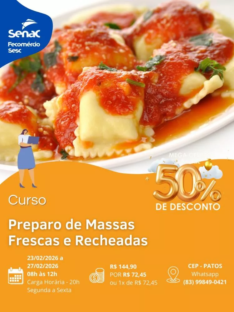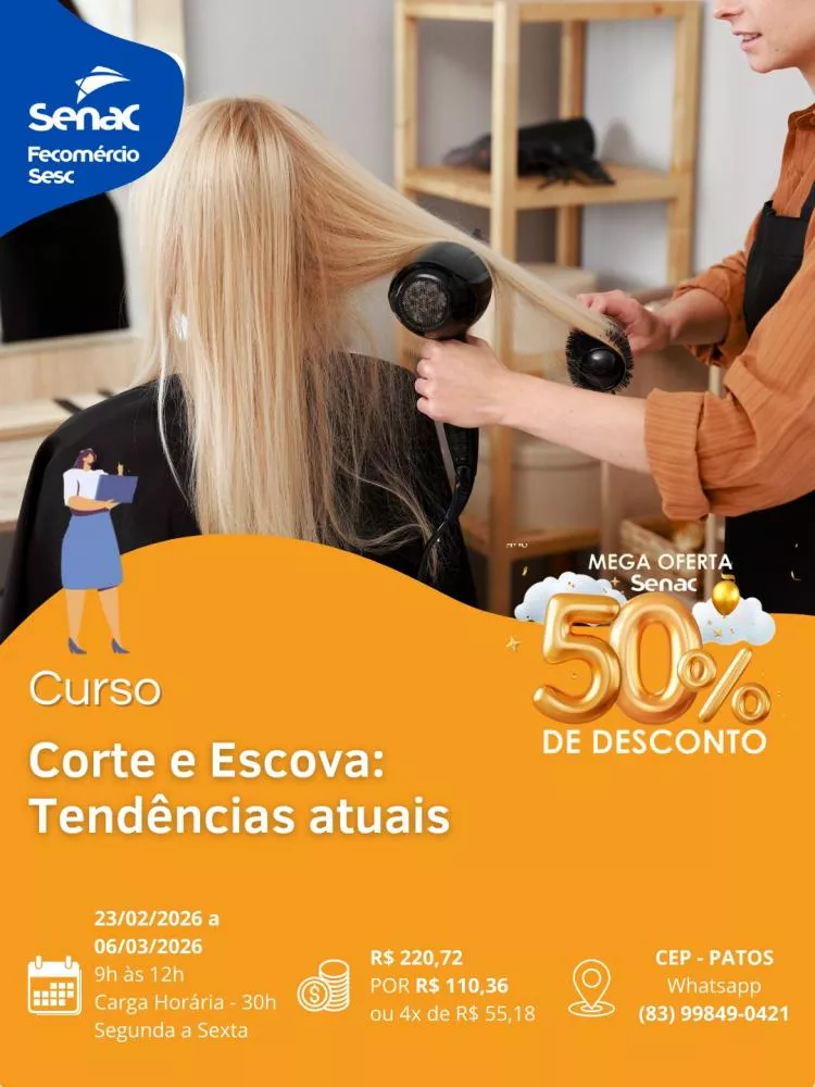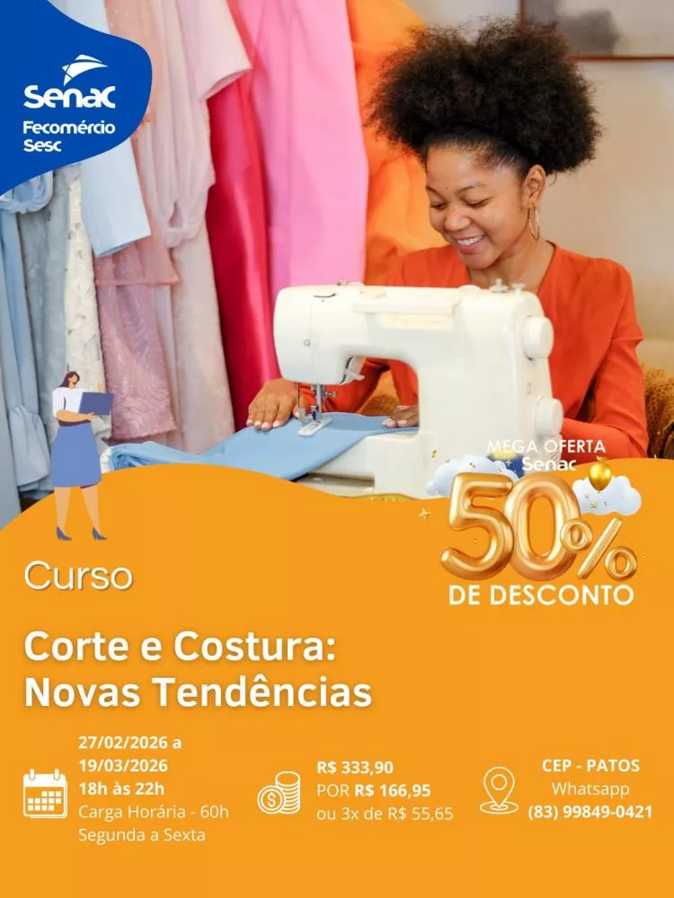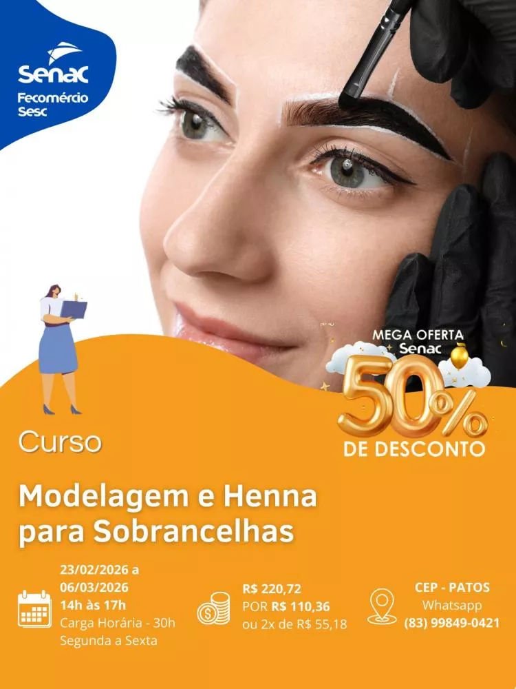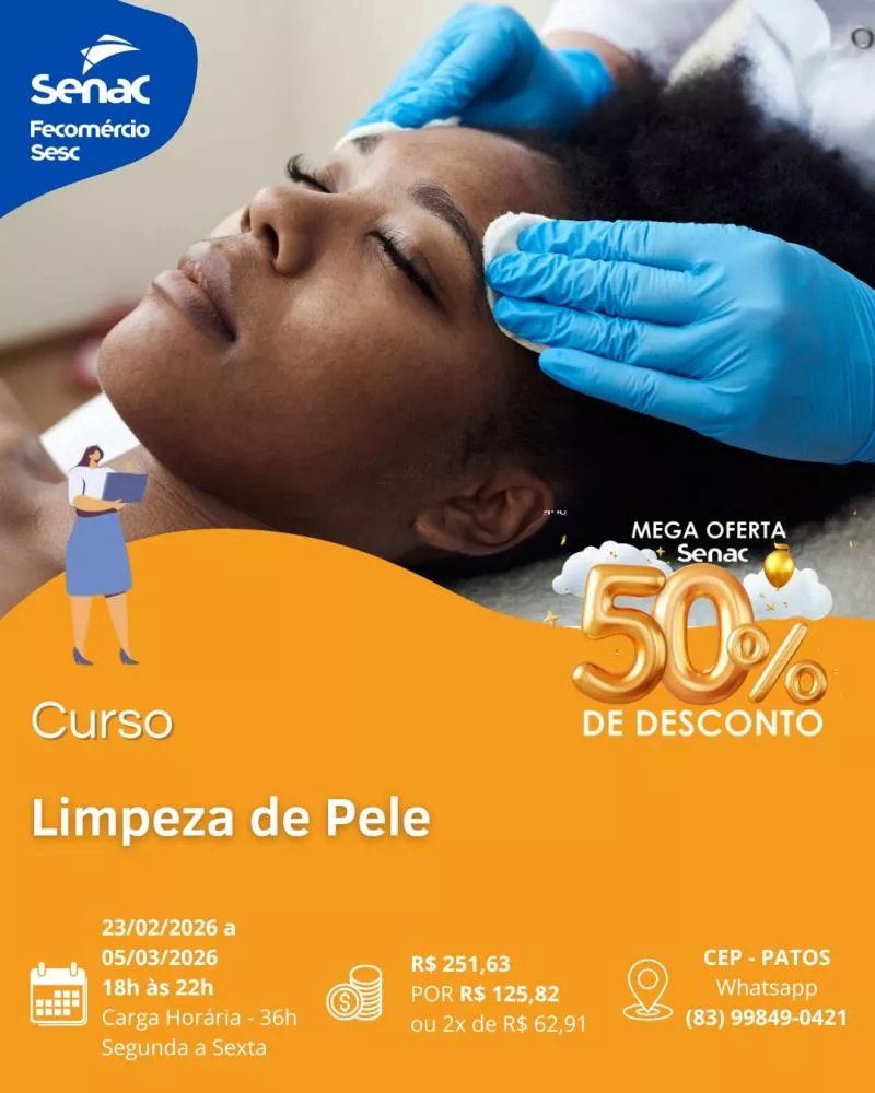 O Serviço Nacional de Aprendizagem Comercial (Senac) da Paraíba está com inscrições abertas para novos cursos profissionalizantes neste mês de fevereiro, oferecendo 50% de desconto em todas as formações disponíveis. As oportunidades abrangem diversas áreas do mercado, como Gastronomia, Tecnologia da Informação, Comércio, Gestão, Moda, Beleza e Saúde.