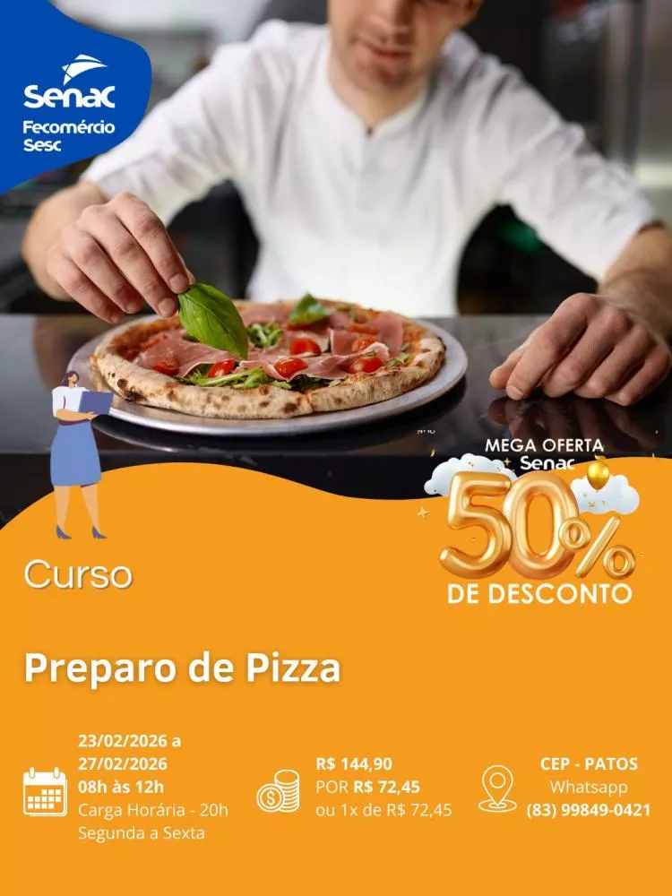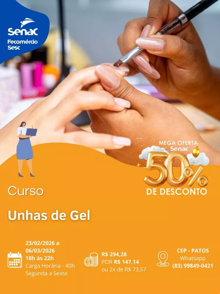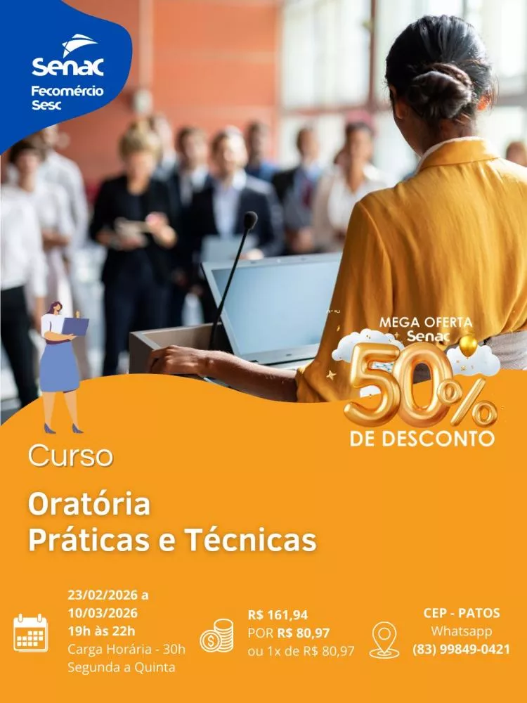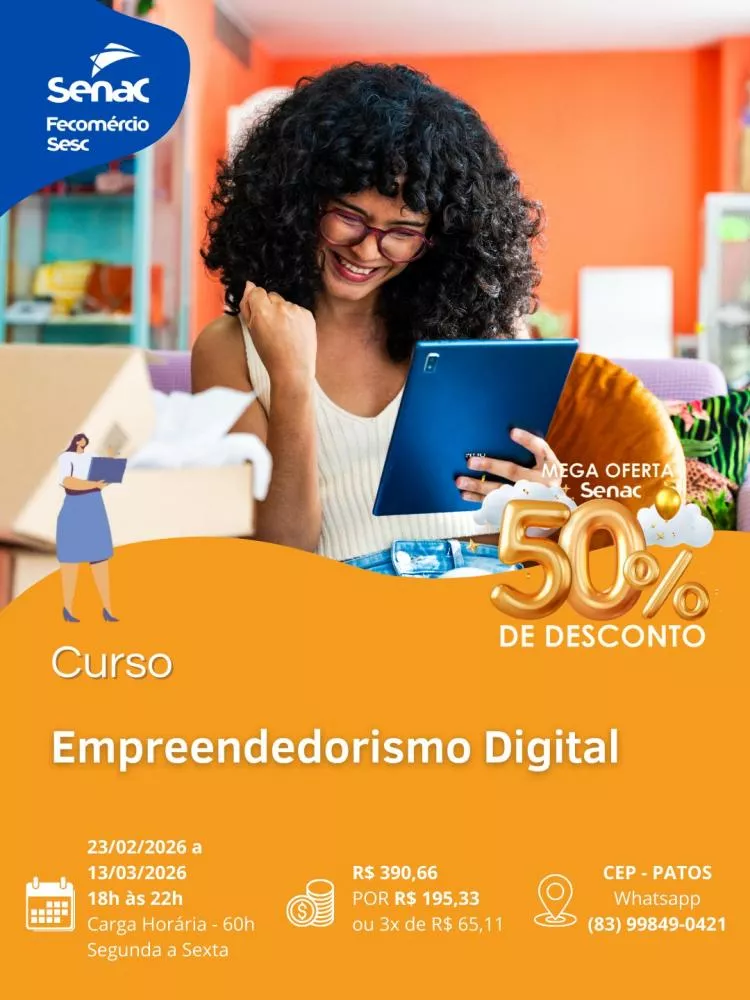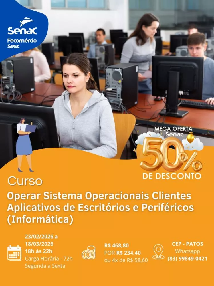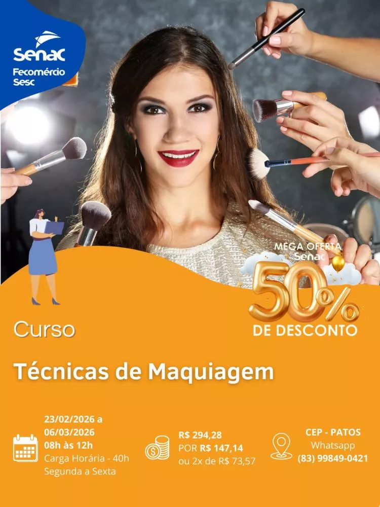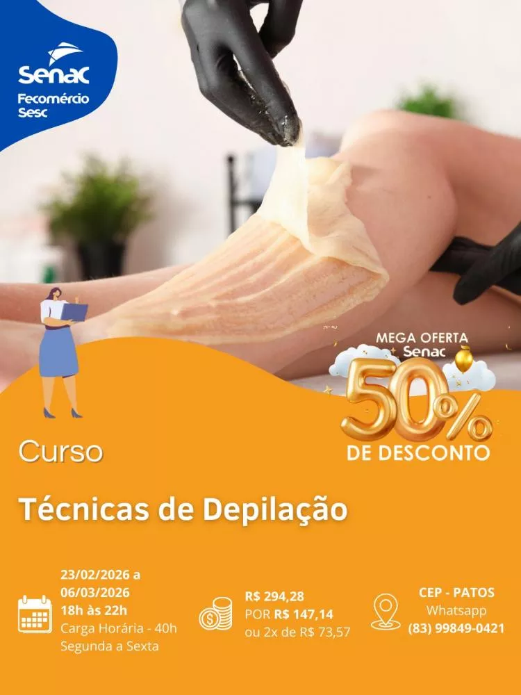 O Serviço Nacional de Aprendizagem Comercial (Senac) da Paraíba está com inscrições abertas para novos cursos profissionalizantes neste mês de fevereiro, oferecendo 50% de desconto em todas as formações disponíveis. As oportunidades abrangem diversas áreas do mercado, como Gastronomia, Tecnologia da Informação, Comércio, Gestão, Moda, Beleza e Saúde.
