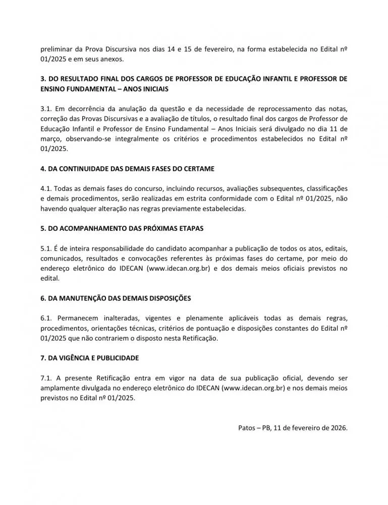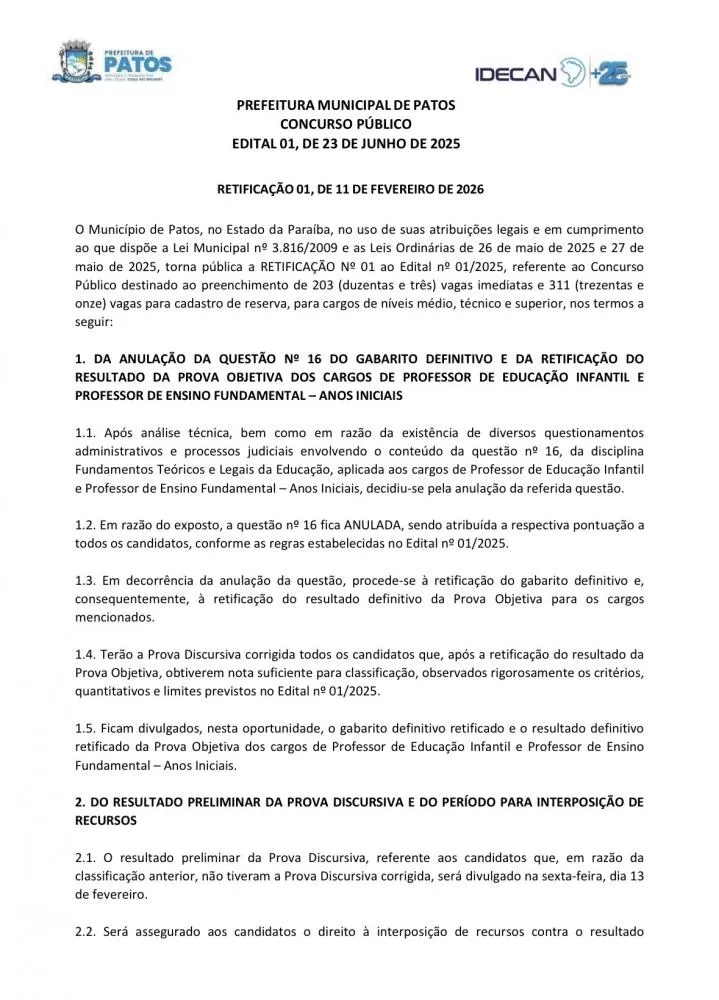 O Idecan publicou, nesta quarta-feira (11), a Retificação nº 01 do Edital 01/2025 do concurso público da Prefeitura de Patos, promovendo alterações específicas para os cargos de Professor de Educação Infantil e Professor de Ensino Fundamental – Anos Iniciais.