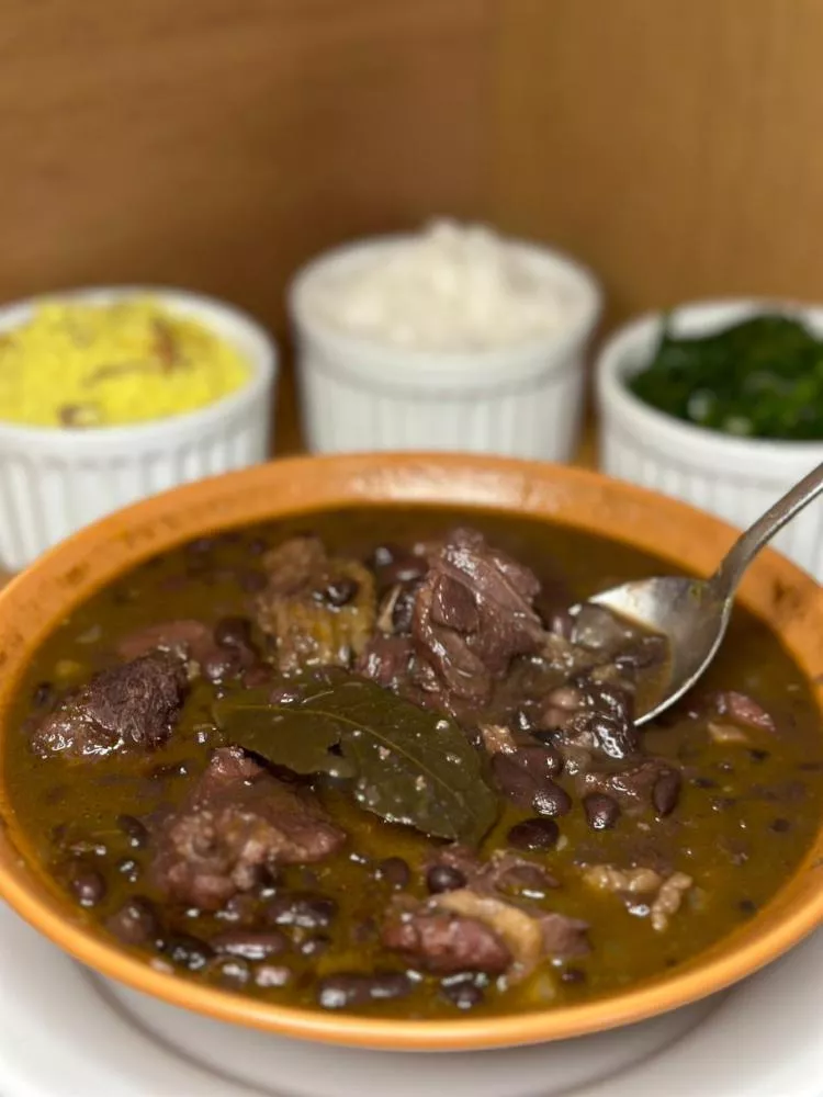 Entre as opções está a feijoada completa, acompanhada de arroz, farofa e vinagrete, ao valor de R$ 250,00, servindo até 10 pessoas.