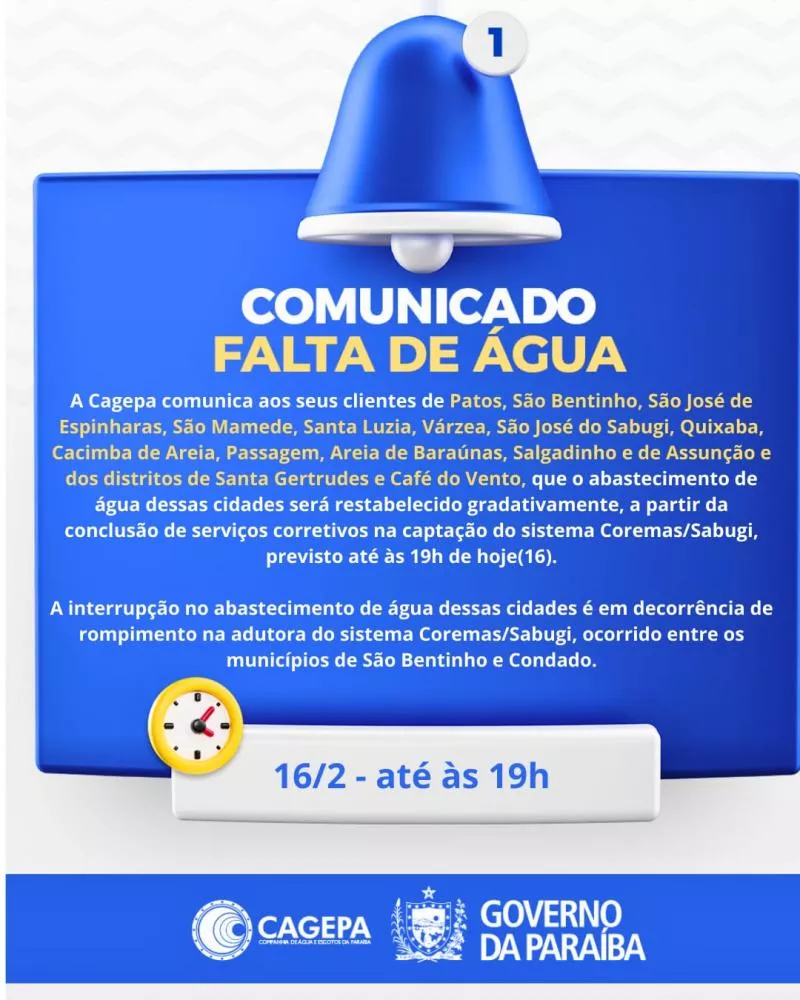 A Companhia de Agua e Esgotos da Paraiba (Cagepa) comunicou que o abastecimento de água em diversos municípios do Sertão paraibano será restabelecido gradativamente após a conclusão de serviços corretivos na captação do sistema Coremas/Sabugi, prevista até as 19h desta segunda-feira (16).