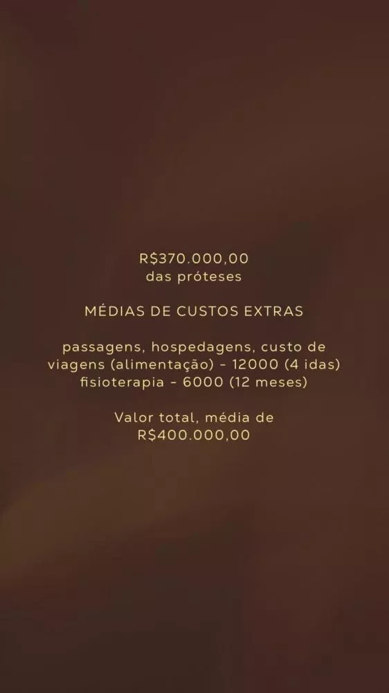 Segundo a jovem, o custo estimado do tratamento gira em torno de R$ 400 mil, incluindo próteses, viagens, hospedagem e sessões contínuas de reabilitação.