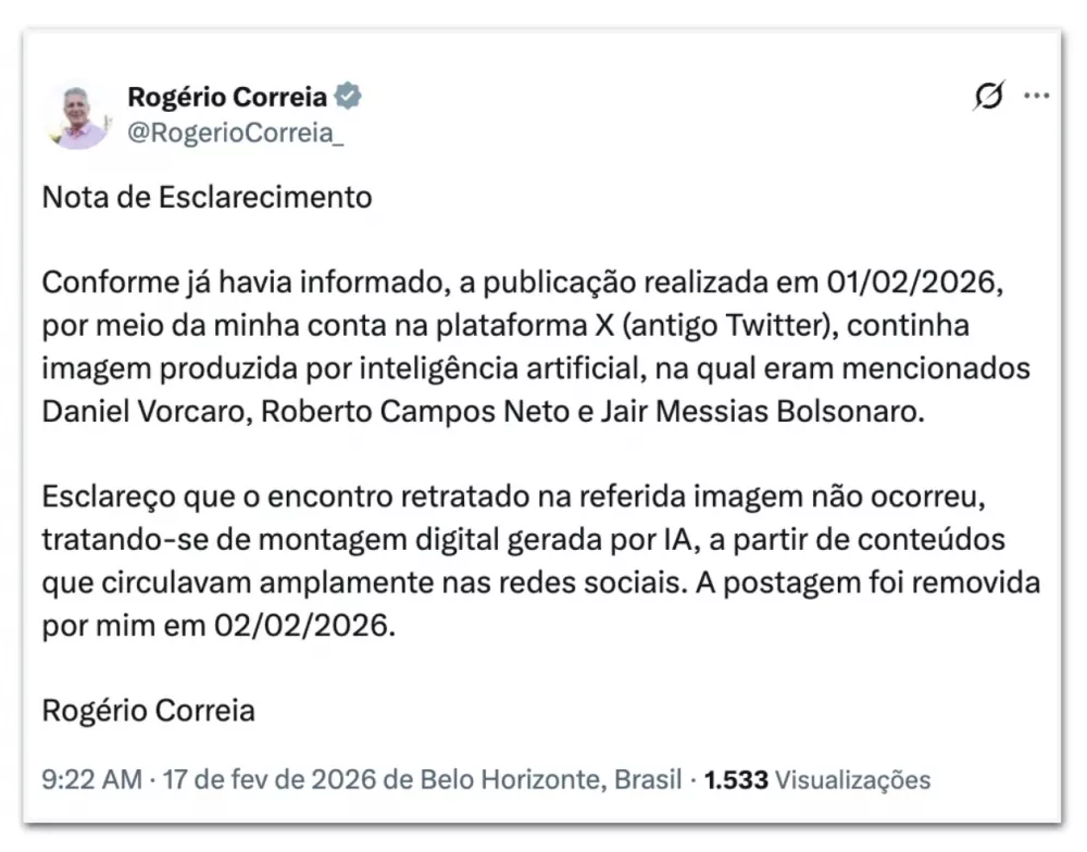 O deputado federal Rogério Correia publicou, nesta terça-feira (17), uma retratação após ter compartilhado em suas redes sociais uma imagem produzida por inteligência artificial que mostrava o ex-presidente Jair Bolsonaro ao lado do banqueiro Daniel Vorcaro, fundador do Banco Master, e do ex-presidente do Banco Central Roberto Campos Neto.