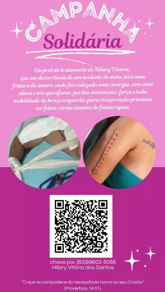 A jovem Hilary Vitória dos Santos, de 22 anos, moradora do bairro São Sebastião, em Patos, está realizando uma campanha solidária para custear sessões de fisioterapia após sofrer um grave acidente de moto ocorrido no dia 4 de dezembro de 2025, na rodovia PB-228, entre os municípios de Quixaba e Patos.