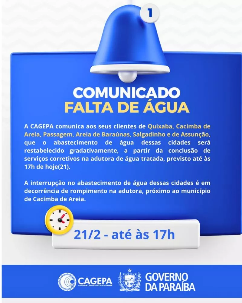 A Companhia de Água e Esgotos da Paraíba (Cagepa) informou que o abastecimento de água nas cidades de Quixaba, Cacimba de Areia, Passagem, Areia de Baraúnas, Salgadinho e Assunção foi interrompido devido ao rompimento de uma adutora de água tratada.