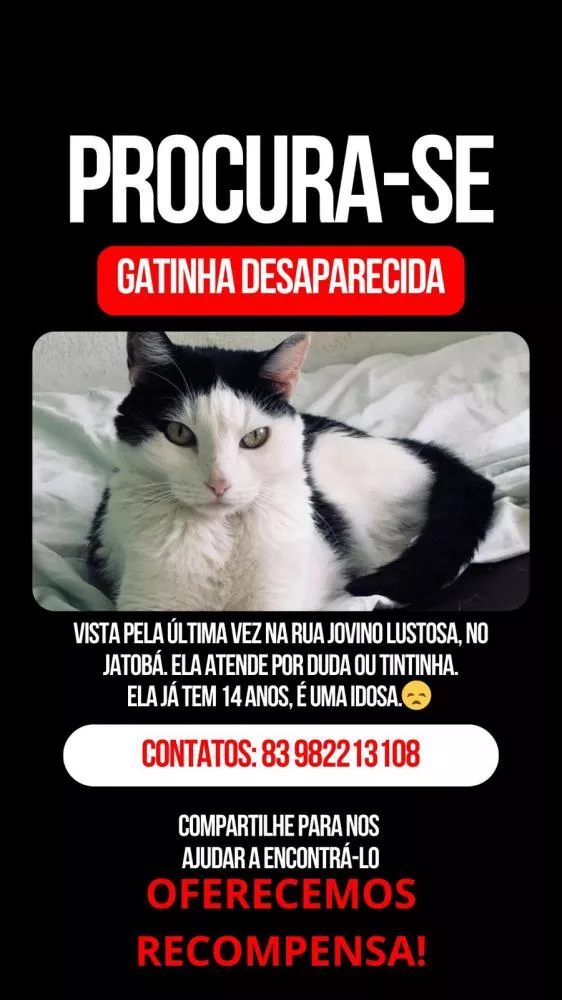 Uma família está à procura da gata Duda, também chamada de Tintinha, que desapareceu na Rua Jovino Lustosa, no bairro Jatobá, em Patos.