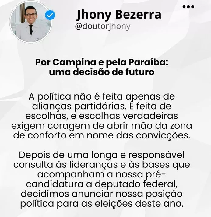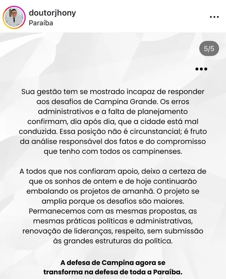 Por fim, acrescentou que sua decisão diz respeito apenas ao cenário político estadual e que se manterá no campo das oposições na política de Campina Grande, em oposição ao prefeito Bruno Cunha Lima, contra quem disputou as eleições de 2024, quando recebeu quase 100 mil votos. Confira as palavras na íntegra: