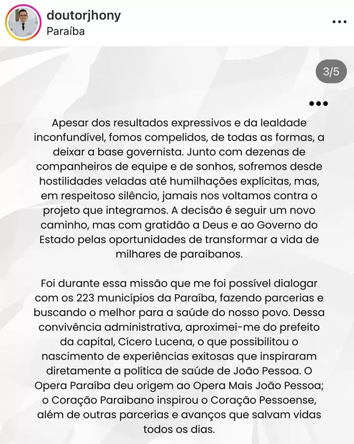 Dr. Jhony Bezerra também citou sua contribuição nas políticas e ações de saúde relativas ao período em que esteve à frente da Fundação PB Saúde, mas fez críticas ao que classificou como humilhações explícitas e hostilidades recebidas de aliados da base da pré-candidatura governista, afirmando ter sido “compelido a deixar a base governista”.
