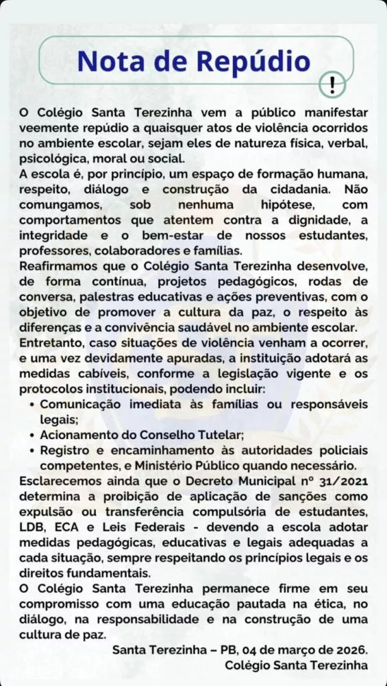 Nesta quarta-feira (4), a direção do Colégio Santa Terezinha também divulgou nota pública reafirmando seu posicionamento contrário a qualquer tipo de violência no ambiente escolar, seja de natureza física, verbal ou psicológica.