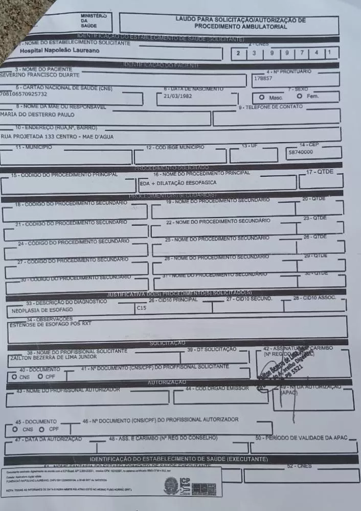 De acordo com Severino, ele irá a João Pessoa nas próximas semanas para realizar um procedimento de dilatação do esôfago, que custará cerca de R$ 1.000,00, incluindo as despesas com o procedimento, medicamentos necessários ao tratamento e a estadia de seu acompanhante.