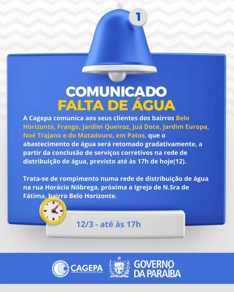 A previsão da Cagepa é de que os trabalhos sejam concluídos até às 17h desta quarta-feira, quando o fornecimento de água começará a ser restabelecido de forma gradativa nas áreas afetadas.