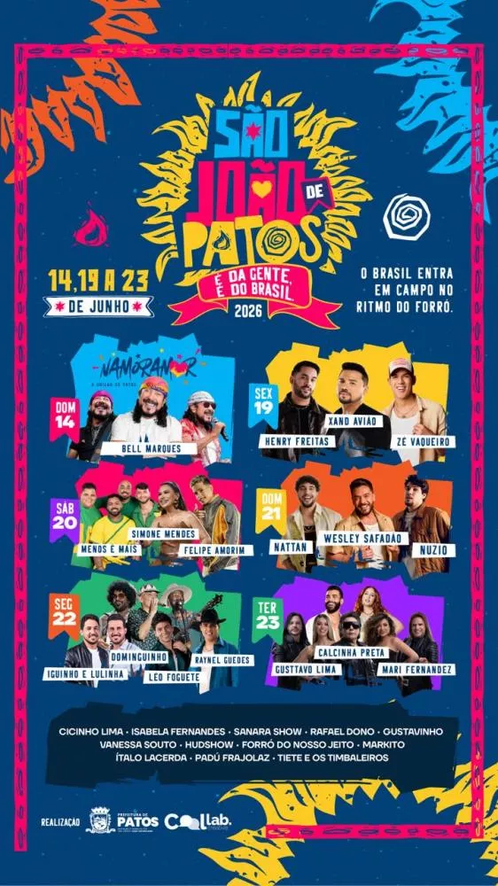 A Prefeitura de Patos, em parceria com a empresa Coollab Creative, divulgou nesta segunda-feira (16) a programação oficial do São João de Patos 2026. O anúncio foi feito durante evento realizado no Patos Shopping.