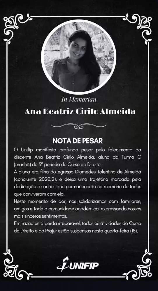 O Unifip manifesta profundo pesar pelo falecimento da discente Ana Beatriz Cirilo Almeida, aluna da Turma C (manhã) do 5º período do Curso de Direito.