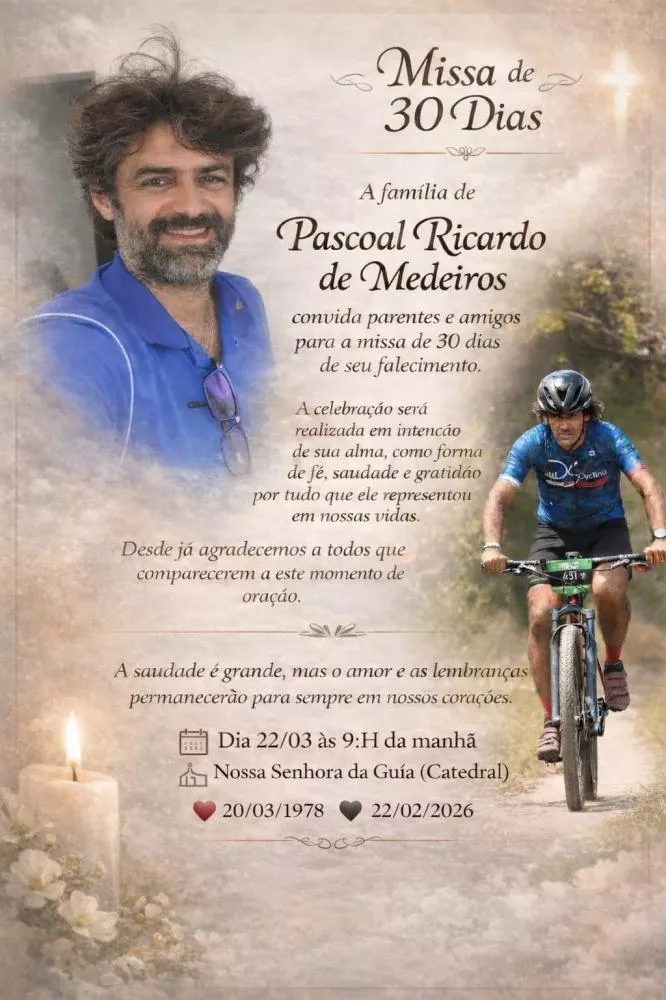 Os familiares do empresário Pascoal Ricardo de Medeiros convidam parentes e amigos para a missa de 30º dia em sufrágio de sua alma. A celebração acontecerá no próximo domingo (22), às 9h, na Catedral de Nossa Senhora da Guia, em Patos.