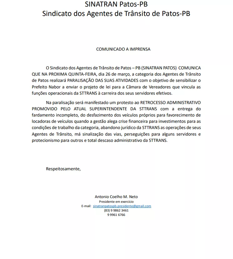Por outro lado, o SINATRAN informou que a paralisação tem como objetivo pressionar o prefeito de Patos, Nabor Wanderley, a encaminhar à Câmara Municipal um projeto de lei que vincule as funções operacionais da STTRANS à carreira dos servidores efetivos.