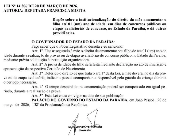 Entrou em vigor na Paraíba a Lei nº 14.306/2026, de autoria da deputada estadual Francisca Motta (Republicanos), que garante às mães o direito de amamentar seus filhos de até 1 ano de idade durante a realização de provas e etapas avaliativas de concursos públicos no estado.