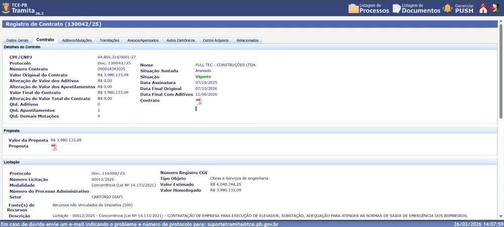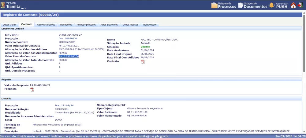 Atualmente, dois contratos estão em vigor para a fase final do projeto, ambos com a empresa Full Tec Construções Ltda., somando investimentos superiores a R$ 17 milhões, conforme consulta ao TCE-PB. O primeiro deles, assinado em 1º de abril de 2024, tem um valor final de 13.058.740,54. Já o último contrato, firmado em 07 de outubro de 2025, tem valor final de R$ 3.980.133,09. As intervenções incluíram ajustes estruturais, adequações de acessibilidade, instalação de elevadores, subestação, além de melhorias exigidas pelos órgãos de segurança.