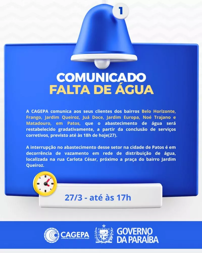 Moradores de diversos bairros de Patos enfrentam interrupção no abastecimento de água nesta sexta-feira (27), após um vazamento registrado em uma rede de distribuição da Cagepa.
