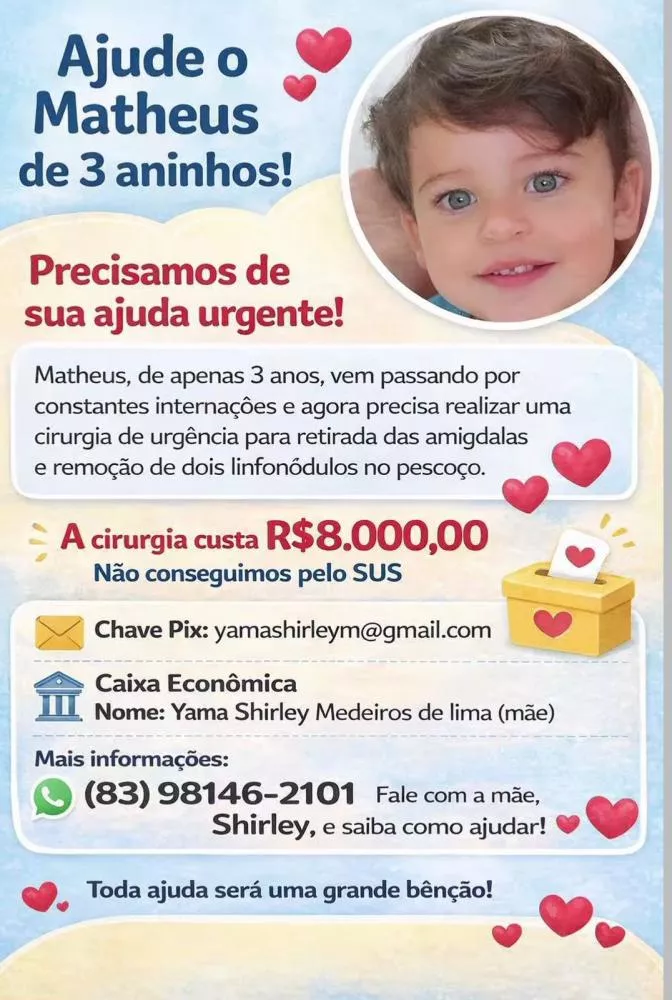 Diante da urgência do caso, a família decidiu recorrer à solidariedade da população para arrecadar o valor necessário e garantir que Matheus passe pelo procedimento o quanto antes.