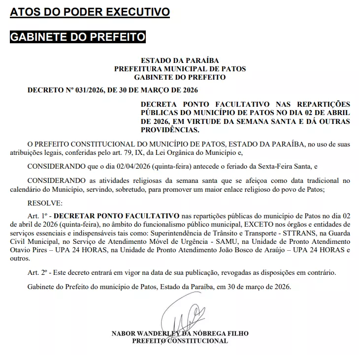 A Prefeitura de Patos publicou, na edição do Diário Oficial desta terça-feira (31), o Decreto nº 031/2026, estabelecendo ponto facultativo nas repartições públicas municipais nesta quinta-feira, dia 2 de abril, em virtude das celebrações da Semana Santa.