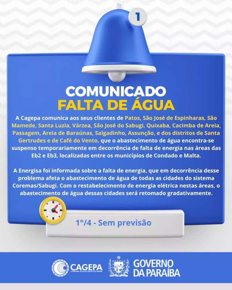 A Companhia de Água e Esgotos da Paraíba (Cagepa) informou que o abastecimento de água está temporariamente suspenso em Patos e em diversos municípios do Sertão paraibano devido a uma falta de energia elétrica nas estações elevatórias EB2 e EB3, localizadas entre as cidades de Condado e Malta.