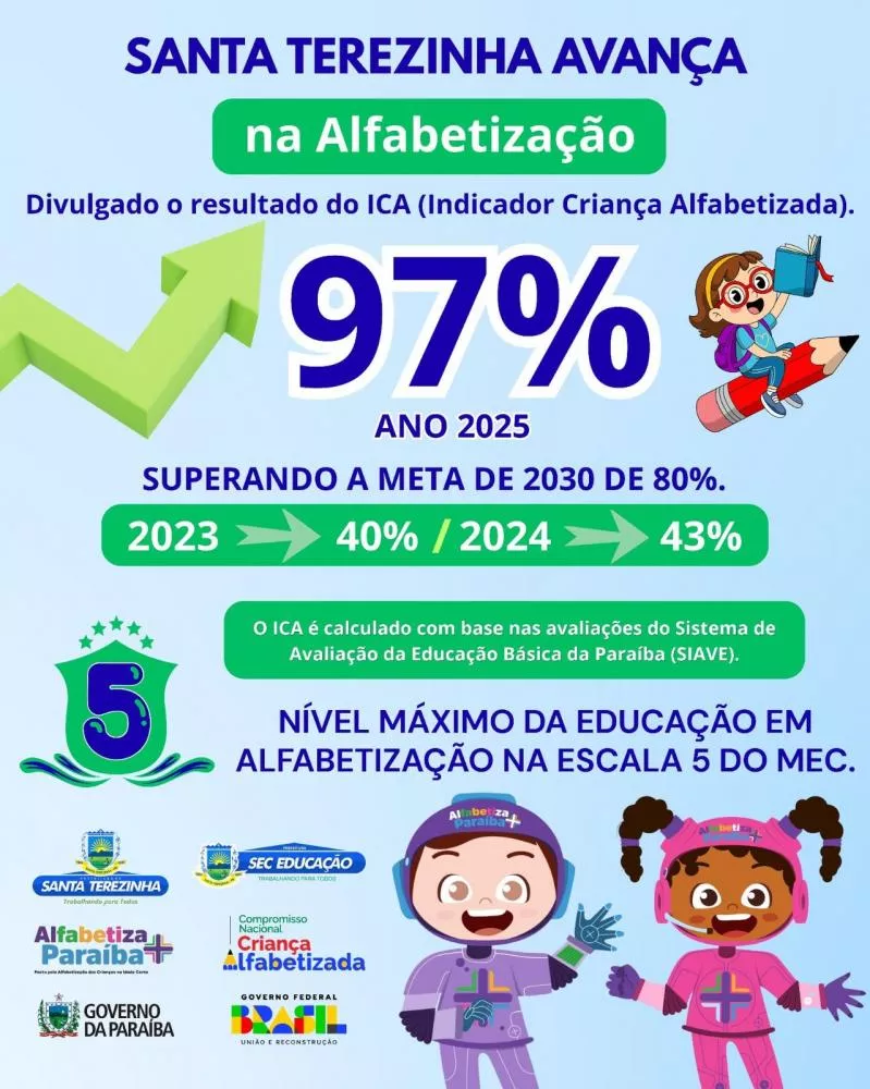 "Com alegria e gratidão, celebramos esse grande resultado do Indicador Criança Alfabetizada ICA de Santa Teresinha. Saímos de 40% em 2023 para 97% das crianças alfabetizadas em 2025, superando a meta estabelecida para nosso município para o ano de 2030! Isso só fortalece nossos esforços e reafirma o compromisso de toda a equipe com a alfabetização de todas as crianças na idade certa. É hora de comemorar, mas também de seguirmos firmes realizando o nosso trabalho com responsabilidade e empenho dobrados para que este resultado siga em ascensão", enfatizou.