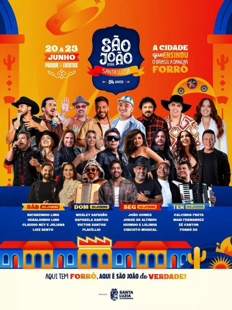 A programação oficial do São João 2026 de Santa Luzia foi divulgada neste sábado (4), confirmando mais uma edição de um dos festejos juninos mais tradicionais do estado. O evento será realizado entre os dias 20 e 23 de junho e contará com grandes nomes da música nordestina.