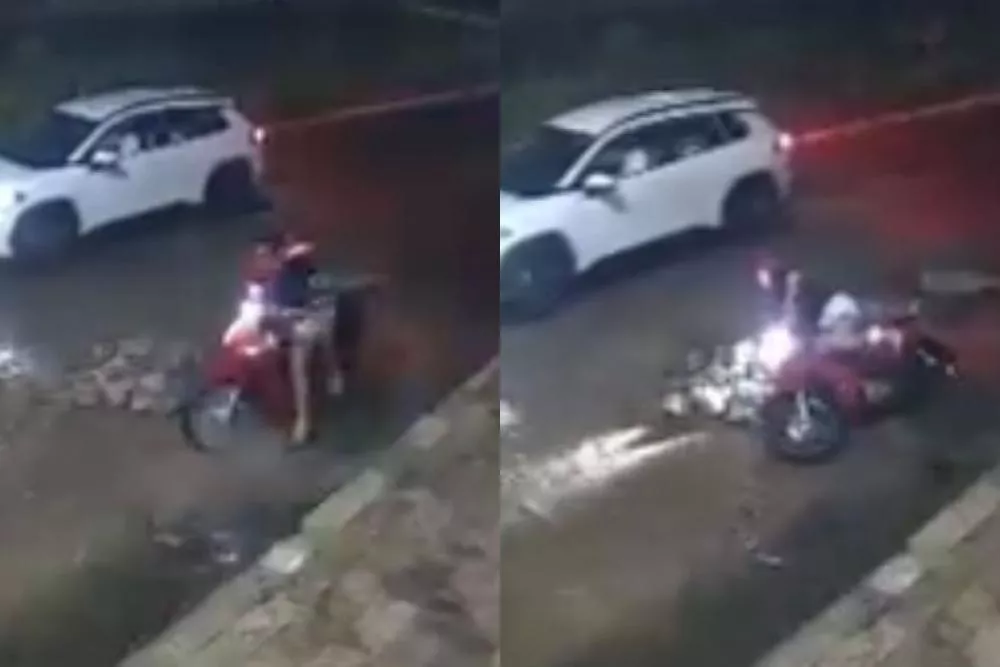 Acidente Mulher sofre queda de moto em galeria aberta no bairro São Sebastião, em Patos; imagens mostram o momento