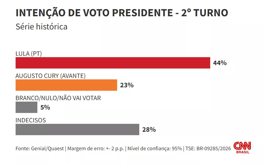Por fim, um cenário com o psiquiatra Augusto Cury (Avante), Lula tem 44% e Cury, 23%.
