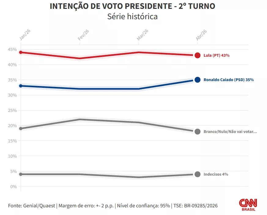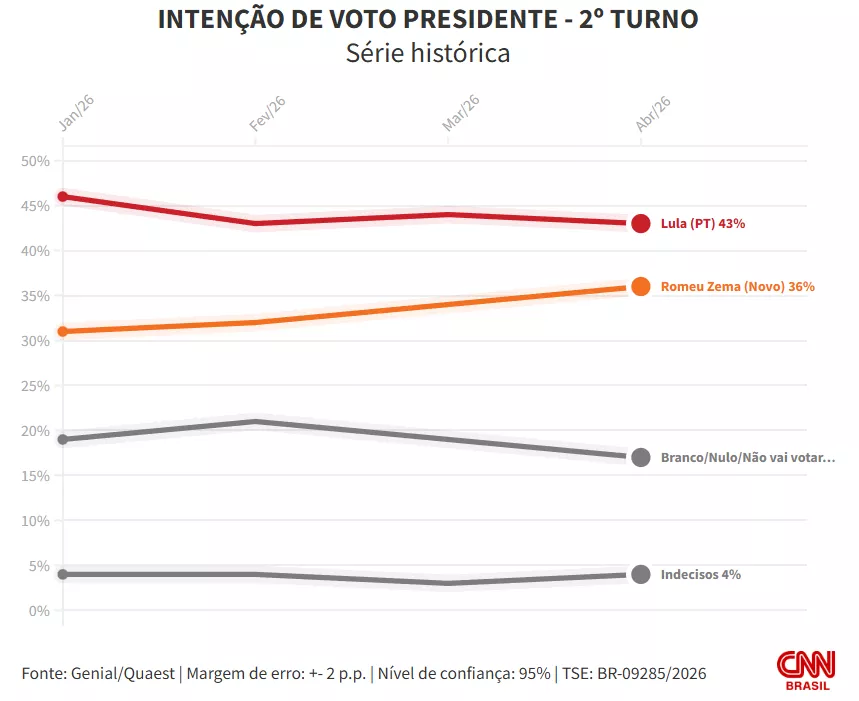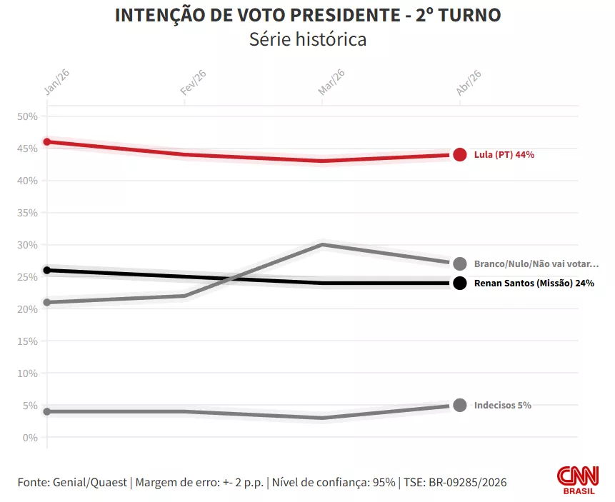 A pesquisa Genial/Quaest entrevistou 2.004 eleitores, entre os dias 9 e 13 de abril, por meio de entrevista presencial. A margem de erro do levantamento é de 2 pontos percentuais, para mais ou para menos, com intervalo de confiança de 95%.