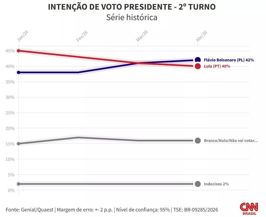 O resultado representa um empate dentro da margem de erro, de 2 pontos percentuais, para mais ou para menos. Na pesquisa anterior, divulgada em março, Flávio e Lula empatavam em 41% (veja detalhes no gráfico abaixo).