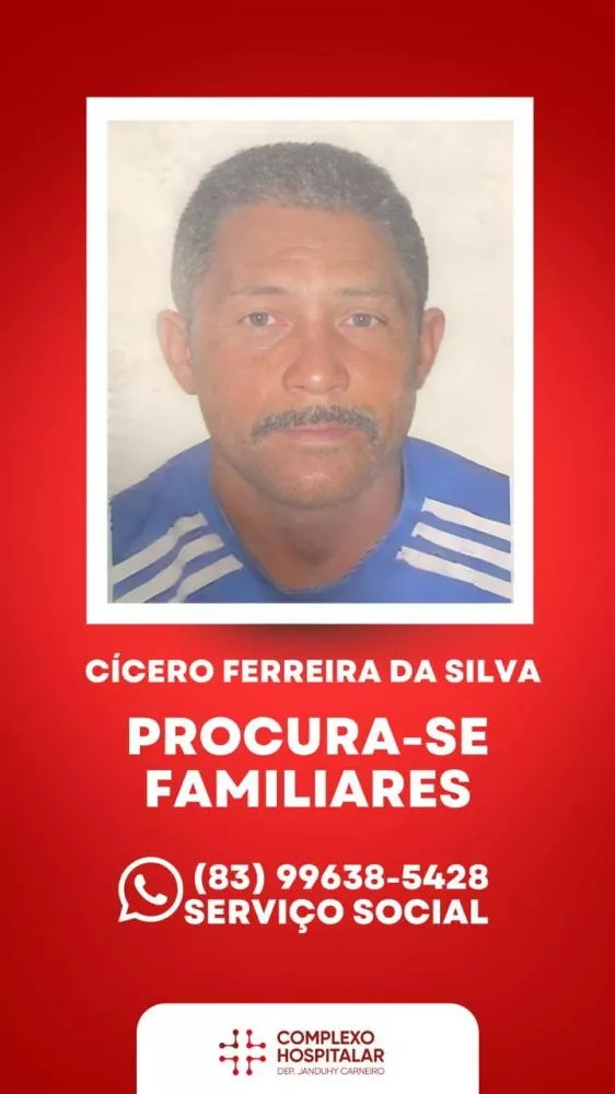 A equipe da unidade solicita que qualquer pessoa que tenha informações que possam ajudar a localizar familiares do paciente entre em contato com urgência por meio do WhatsApp do Serviço Social, pelo número (83) 99638-5428.