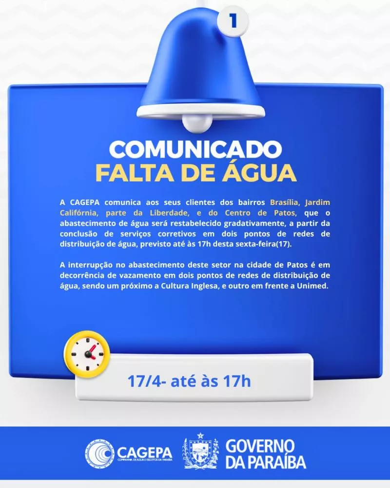 A CAGEPA informou a interrupção temporária no abastecimento de água em diversos bairros de Patos, nesta sexta-feira (17), em decorrência de serviços de manutenção na rede de distribuição.