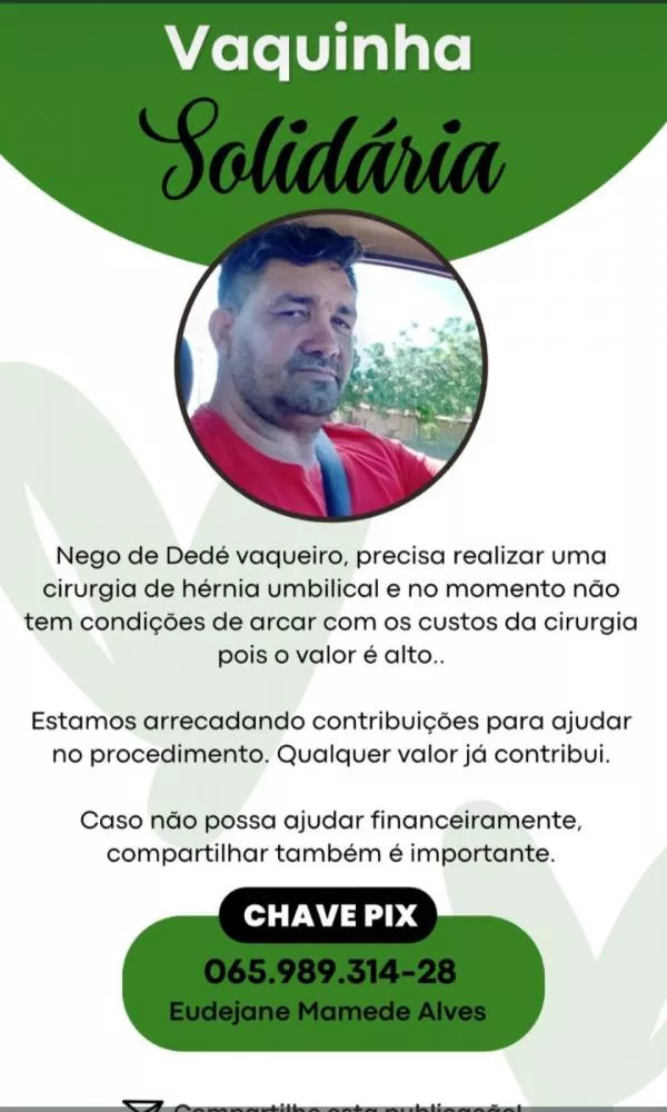 O morador de Santa Terezinha, conhecido popularmente como Nego Taxista, está realizando uma campanha solidária para arrecadar recursos e custear uma cirurgia de hérnia umbilical. Segundo informações divulgadas pela família, ele precisa passar pelo procedimento, mas enfrenta dificuldades financeiras para arcar com os custos, considerados altos.