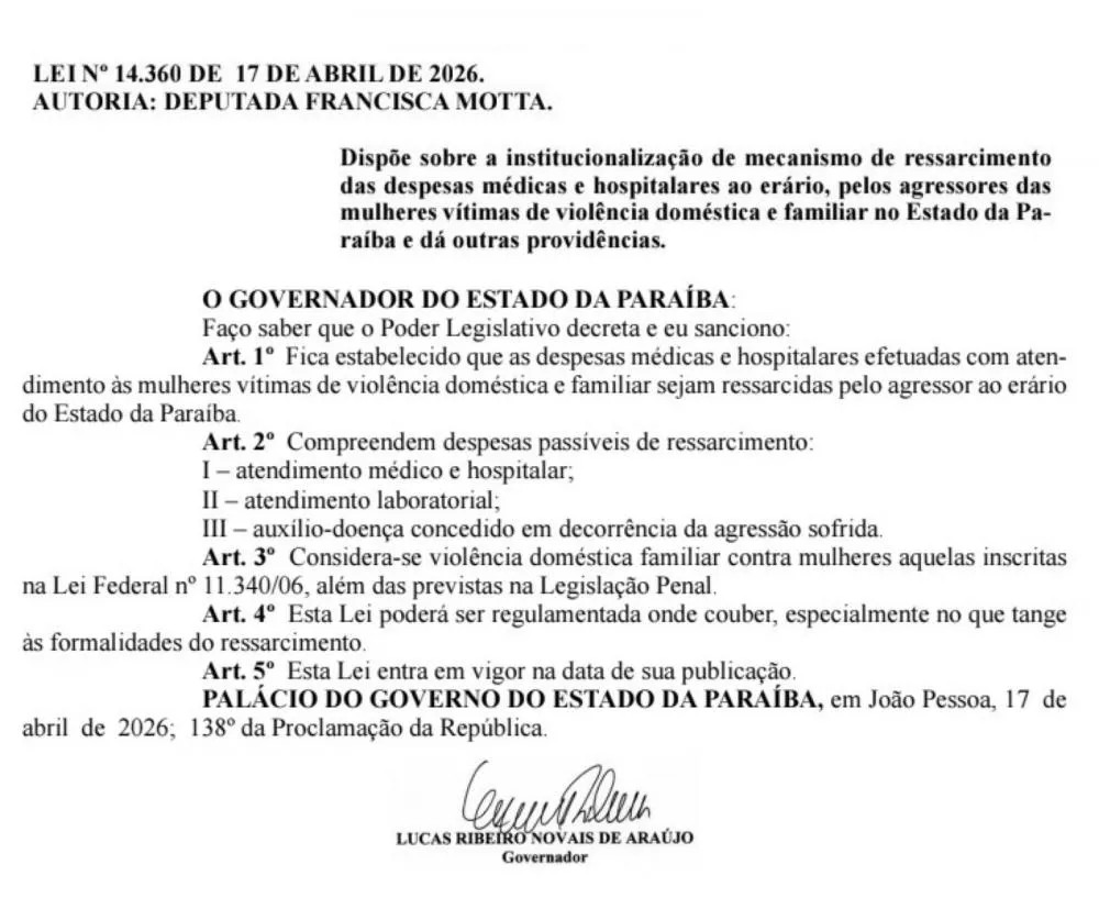 A Paraíba dá mais um passo firme no enfrentamento à violência contra a mulher com a sanção da Lei nº 14.360/2026, de autoria da deputada estadual Francisca Motta (Republicanos). A nova legislação, sancionada pelo governador Lucas Ribeiro nesta sexta-feira (17), estabelece que agressores deverão ressarcir o Estado pelas despesas médicas, hospitalares e demais custos gerados no atendimento às vítimas de violência doméstica e familiar.
