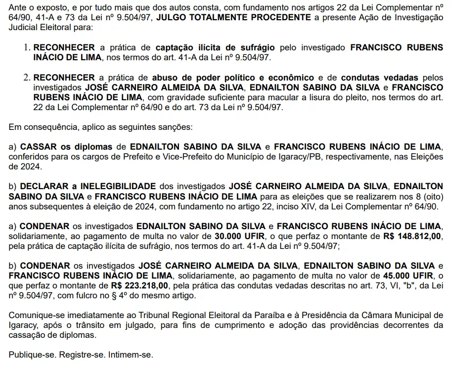 A sentença ainda determina que, após o trânsito em julgado, o Tribunal Regional Eleitoral da Paraíba e a Câmara Municipal de Igaracy sejam comunicados para adoção das medidas cabíveis.