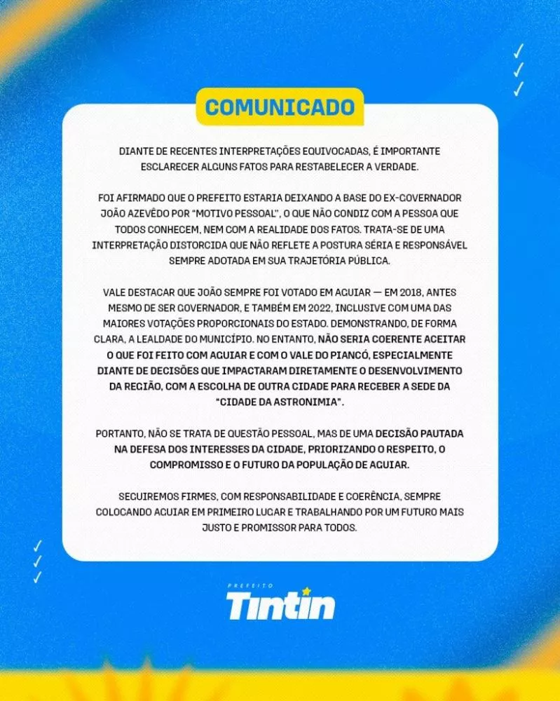 Na nota, o gestor também contesta diretamente o comentário equivocado que atribuiu a mudança de posicionamento a um suposto “motivo pessoal”. Tintin classifica a interpretação como equivocada e ressalta que seguirá firme em suas decisões, priorizando o respeito à população e o compromisso com o desenvolvimento local.