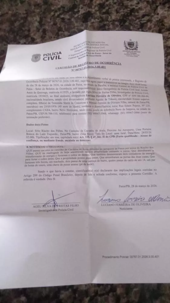 Um internauta, vítima da ação criminosa, registrou um boletim de ocorrência e fez um apelo público cobrando respostas das autoridades. Segundo ele, mesmo após mais de um mês do registro, ocorrido na localidade Riacho dos Pilões, próximo à estrada que liga a Cacimba de Areia, os casos continuam sendo relatados com frequência nas redes sociais e em comunidades locais.