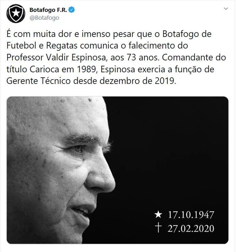 Morreu na manhã desta quinta-feira o coordenador técnico do Botafogo, Valdir Espinosa, aos 72 anos. O ex-treinador estava internado há uma semana em um hospital no Rio de Janeiro para tratar uma infecção intestinal e teve complicações pós-operatórias.