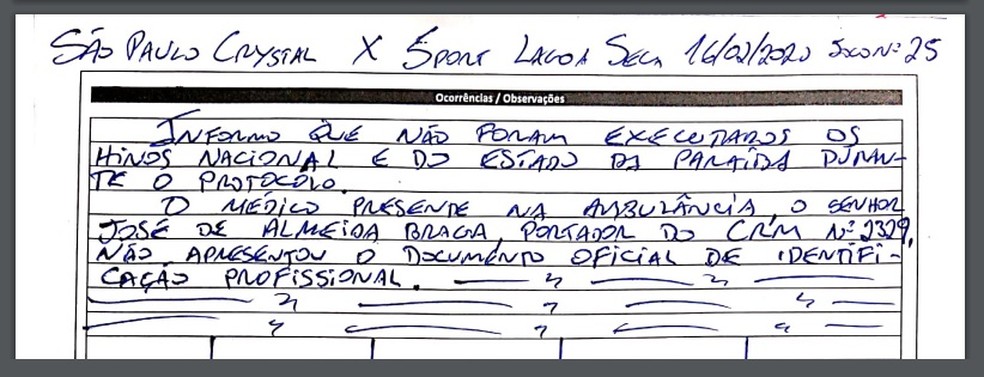 O Tribunal de Justiça Desportiva de Futebol da Paraíba (TJDF-PB) denunciou o São Paulo Crystal pela não execução dos hinos do Brasil e da Paraíba na partida contra o Sport Lagoa Seca, no dia 16 de fevereiro, pela quinta rodada do Campeonato Paraibano. O duelo aconteceu no Estádio Carneirão, em Cruz do Espírito Santo. A Procuradoria requer uma multa de, no mínimo, R$ 5 mil ao Tricolor.