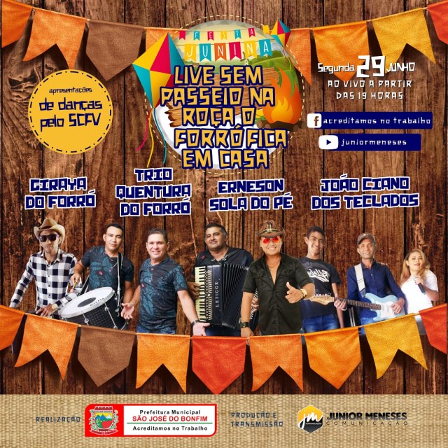 A Prefeitura de São José do Bonfim realiza live para recordar o Passeio na Roça, evento junino que acontece todos os anos no município, mas que devido a pandemia esse ano não foi possível realizar, então se adaptando ao novo momento, a Prefeitura Municipal vai realizar um evento online pela as redes sociais com artistas da terra e apresentação de danças juninas pelo grupo do Serviço de Convivência e Fortalecimento de Vínculos.