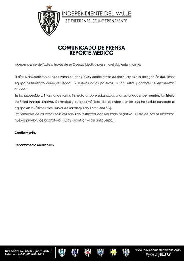 Os resultados foram obtidos após exames PCR feitos no final de semana antes da viagem ao Brasil. Os jogadores infectados permaneceram no Equador em quarentena. Segundo a nota divulgada pelo Del Valle, os testes ocorreram no último sábado, após o jogo contra o Barcelona de Guayaquil pelo campeonato local.