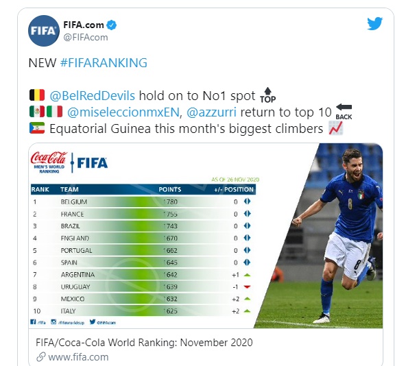 Uma seleção muito tradicional que retorna ao top 10 do ranking após quatro anos é a Itália, que em novembro venceu suas duas partidas pela Liga das Nações (competição entre seleções europeias).