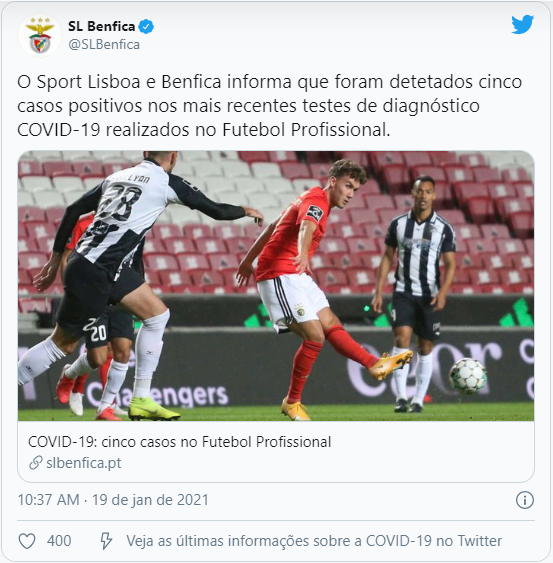 O clube de futebol português Benfica relatou um surto do novo coronavírus (covid-19) nesta terça-feira (19), anunciando que 17 pessoas, entre jogadores, membros da comissão técnica e funcionários, tiveram resultados positivos.