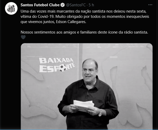 O Santos usou as suas rede sociais para lamentar o falecimento de Edson, que trabalhou em diversas rádios do litoral paulista e, atualmente, apresentava o programa Baixada Esporte, da TV Santa Cecília. “Uma das vozes mais marcantes da nação santista nos deixou nesta sexta, vítima do Covid-19. Muito obrigado por todos os momentos inesquecíveis que vivemos juntos, Edson Callegares. Nossos sentimentos aos amigos e familiares deste ícone da rádio santista.”